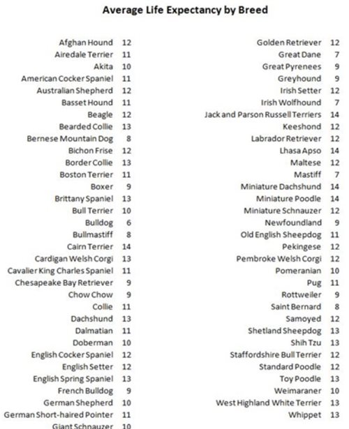 It applies to both the overall size of the dog affecting its lifespan and its life stage. Dogs age faster in their first couple of years of life, and bigger breeds of dog age more quickly than their smaller counterparts. Below is a list of a variety of breeds put together by Dr. Kelly M. Cassidy, and their average life expectancies. Below is a chart published by the American Kennel Club that lists dog age conversions based on their adult weight.